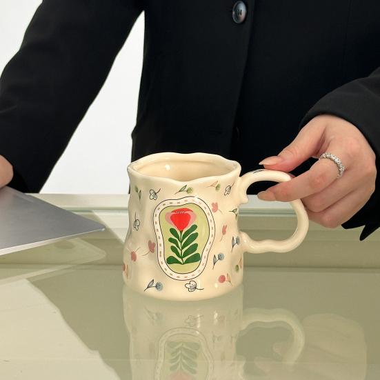 Unique Aesthetic with Exquisite Detailing: Showcasing an irregularly shaped body and a gracefully curved handle, this irregular shape cup is adorned with a delicate flower pattern in soft, vibrant colors. Its artistic design adds stunning visual appeal, making it perfect for personal use or as a thoughtful gift that stands out.