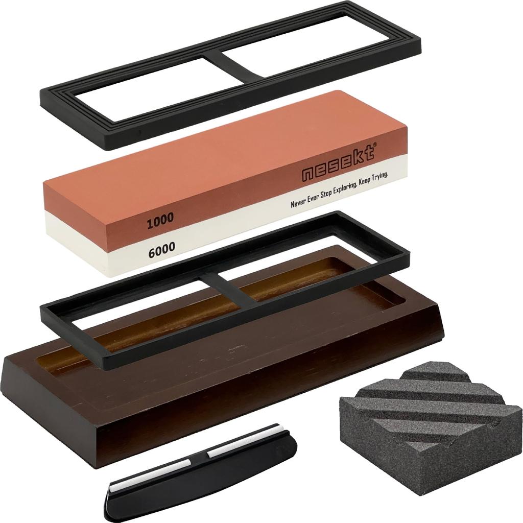 [A complete set that even beginners can use with confidence] In addition to the whetstone itself, this complete set also includes an auxiliary tool (angle-fixing holder) that allows you to sharpen knives at a constant angle, a grooved surface-straightening whetstone (a whetstone for keeping the surface of the whetstone smooth), a bamboo base (with anti-slip rubber already attached to the back), two simple rubber bases, and an instruction manual.