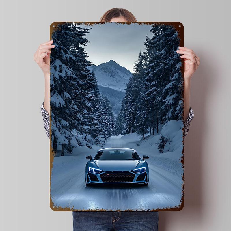 Sports Car R8 In Winter Wonderland Metal Poster Customized Wall Art Retro Vintage Tinplate Signs for Man Cave Office Decoration