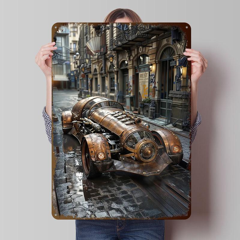 Steampunk Car In City Tinplate Poster Customized Wall Art Vintage Metal Signs Retro Tin Plaque for Bedroom Decoration Gaming