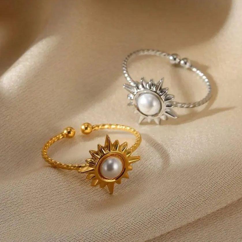 Exquisite Elegant Pearl Sun Open Ring For Women Adjustable Faux Pearl Stainless Steel Ring Wedding Daily Jewelry Gift