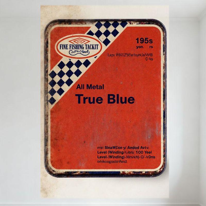 Vintage 1950s Fine Fishing Tackit Co. Tin Box 'All Metal True Blue' Distressed Retro Metal Container for Collectibles, Wall Deco