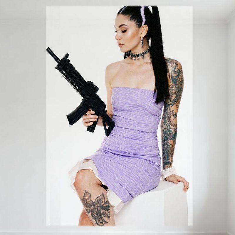 Sexy Woman High Ponytail Light Purple Dress Tattooed Arm Black Rifle Tin Sign Vintage Metal Wall Decor for Home Bar Pub Decorati