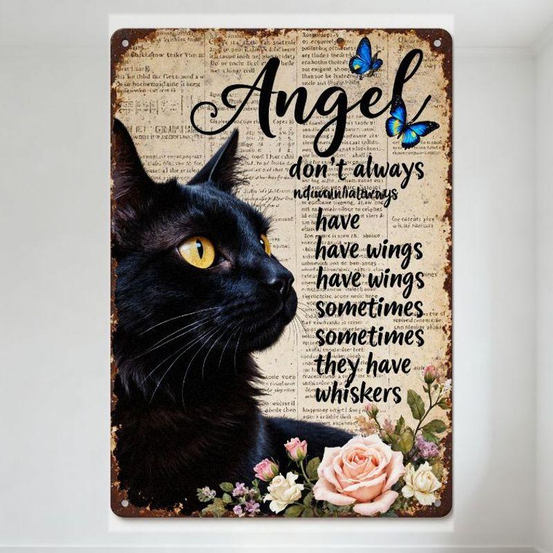 Vintage Black Cat Metal Sign with Yellow Eyes, 'Angel' Cursive Text, Butterflies, Rustic Whiskers Quote - Old Newspaper Backgrou