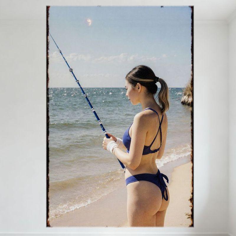 Sexy Woman In Blue Bikini On Sandy Beach Metal Tin Sign, Fishing Rod & Calm Ocean Scene, Vintage Home Bar Wall Decor Art Poster