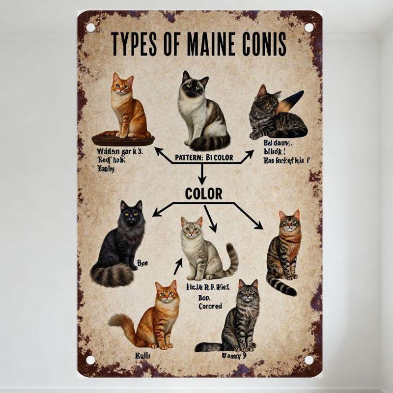 Vintage Maine Coons Types Tin Sign Metal Poster - Rustic Educational Decor with 6 Cat Illustrations for Bar Pub Home Wall Decor
