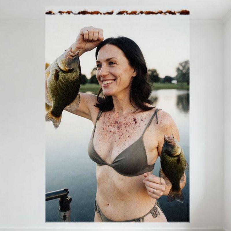 Sexy Bikini Woman with Freshly Caught Fish Lake Scene Tin Sign Vintage Metal Poster for Bar Pub Home Wall Decor 8x12 Inch