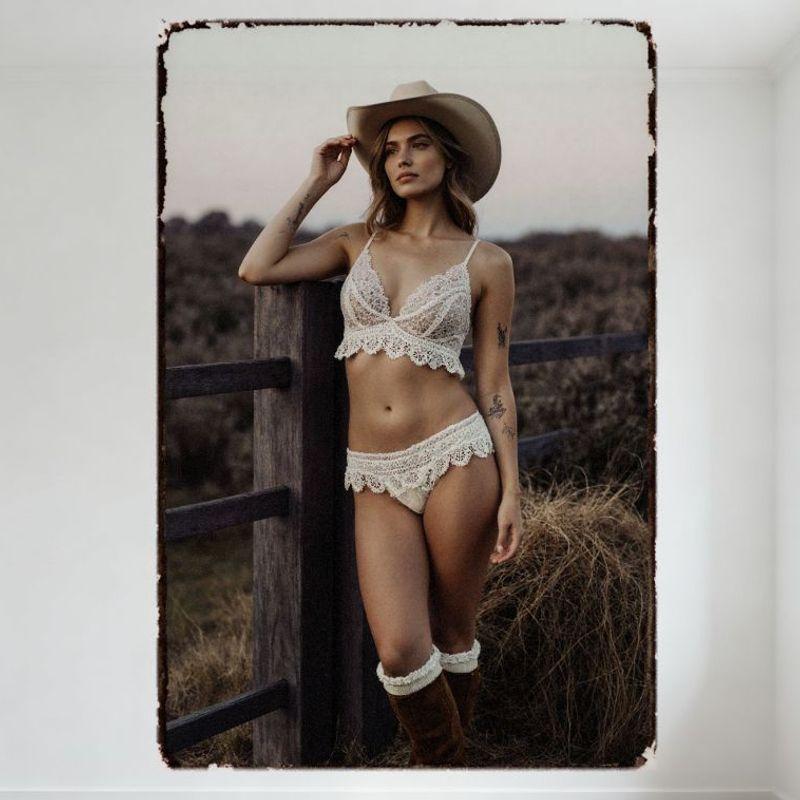 Sexy Vintage Cowgirl Metal Tin Sign Rustic Field Hay Bales Wooden Fence Outdoor Wall Decor for Bar Home Cafe, 8x12 Inch