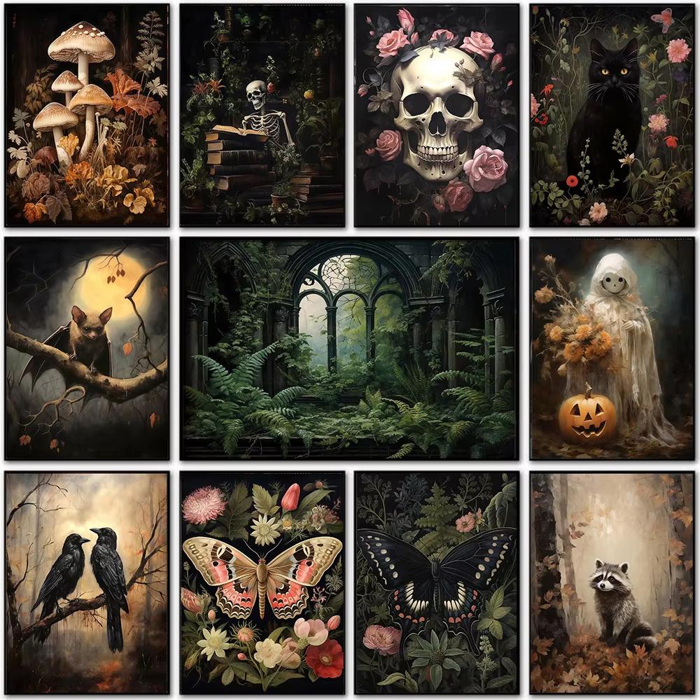 Forest Animals Butterfly Bat Plants Flowers Canvas Wall Art Nature Diamond Painting Decor Vintage Dark Skeleton Pumpkin Halloween
