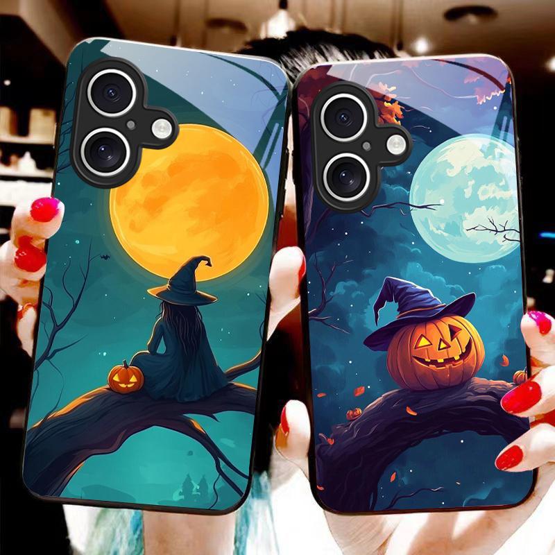 Witch Pumpkin Lantern For For iPhone 16E 15 14 13 Plus 12 Mini 11 Pro Max XR Xs X 7 8 6S 22 20 Black Tempered Glass Phone Case