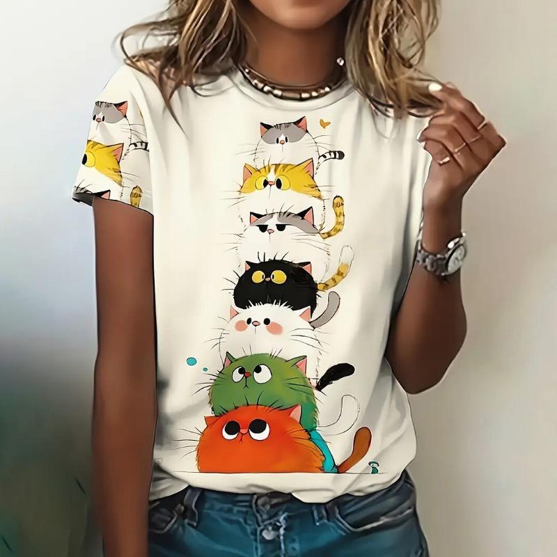 Summer Women's T-Shirts Casual Short Sleeve Crew Neck Tee Fashion Streetwear Female Oversized Clothing Cartoon Cat T-Shirts