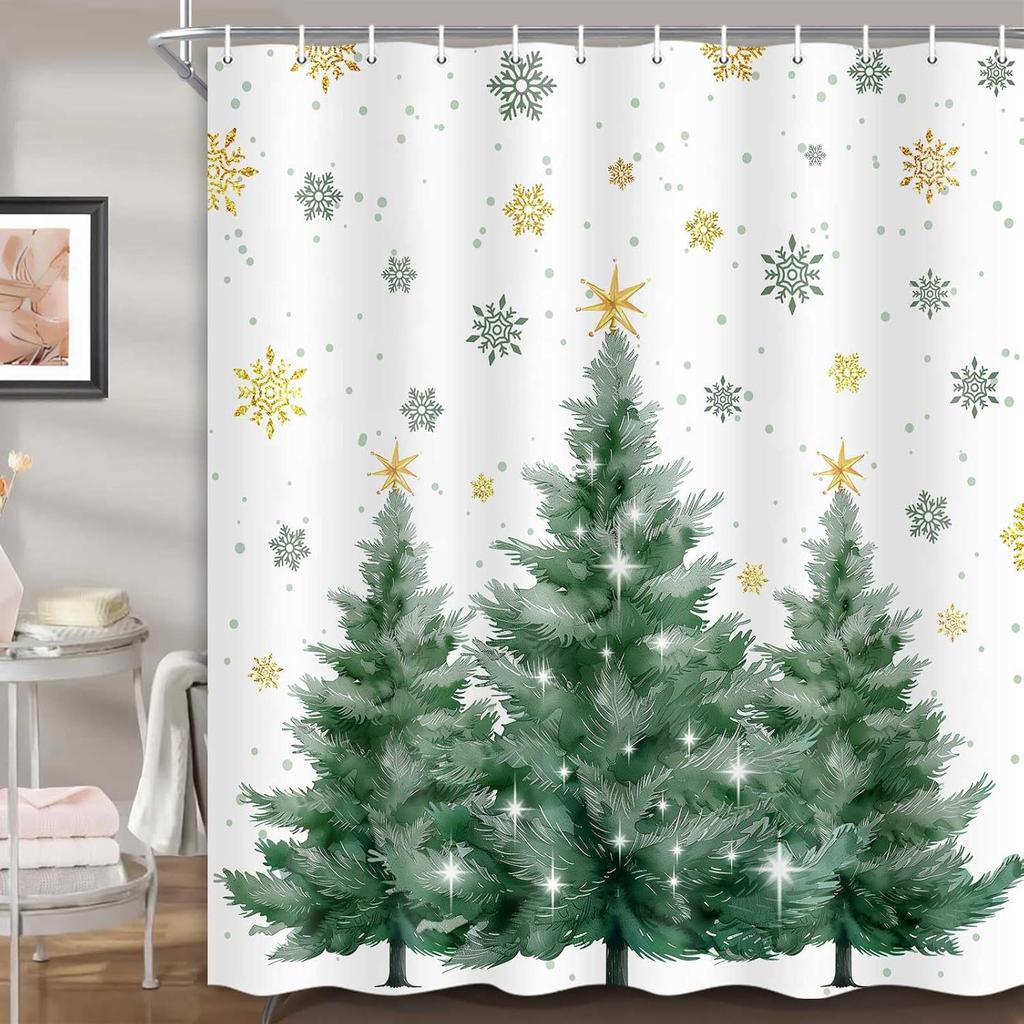 Christmas Tree Shower Curtain Green Trees Snowflake Decorative Bath Curtain Xmas Holiday Waterproof Fabric Bathroom Curtain Se