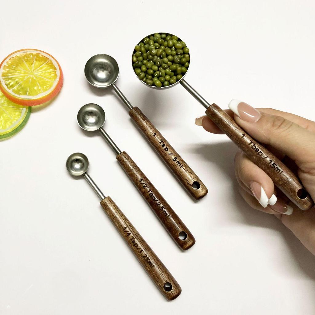 Multifunctional Oak-Handled Stainless Steel Measuring Spoon for Kitchen Baking