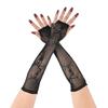 Long black mesh gloves extend elegantly to the upper arm, featuring intricate skull fishnets patterns for a bold, eye-catching look—perfect for stage performances, cosplay, or themed parties."