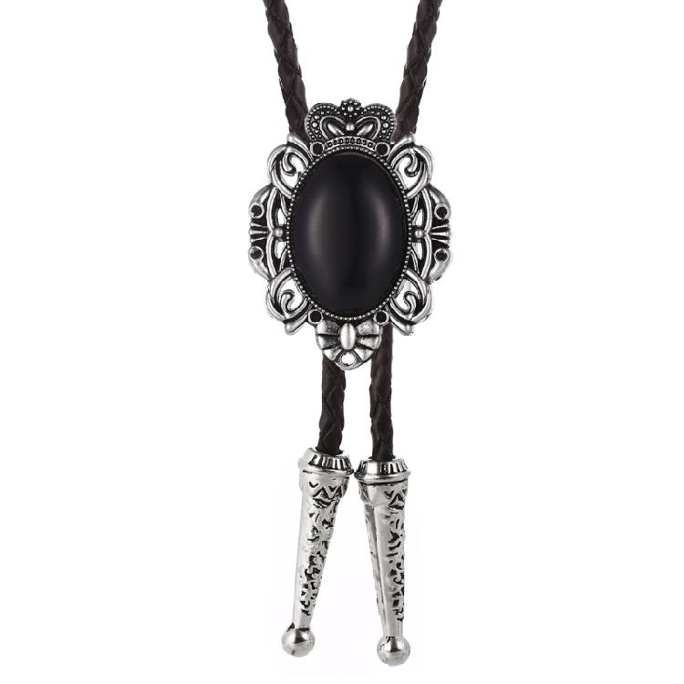 Western Cowboy Vintage Metal Flower Crown Stone Pendant Bolo Tie Braided Leather Rope Necktie Necklace Jewelry Neckwear