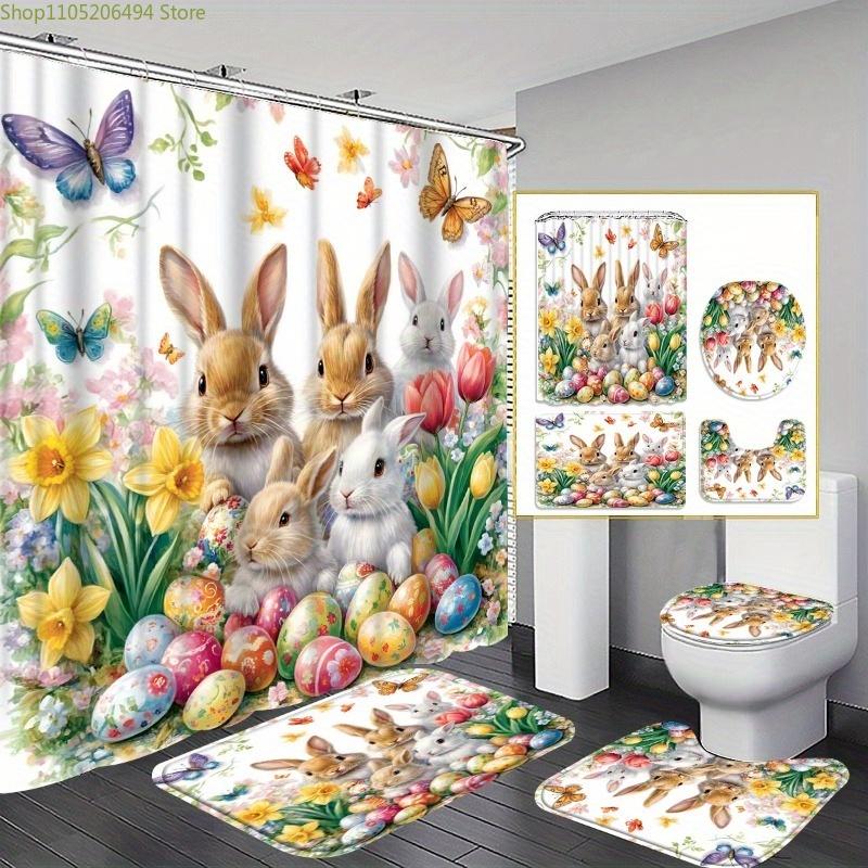 1/3/4pcs Easter Bunny & Egg Bath Set with Shower Curtain (180x180cm), Rug, U-Pad & Toilet Cover - Cute Spring Bathroom Decor,