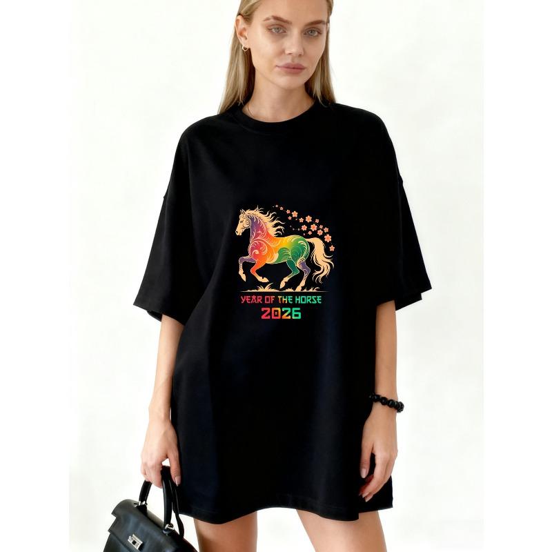 T Shirt Black Rainbow Horse Year Of The Horse 2026 Print Casual Wear For Women Fashion Statement Piece Summer Outfit Streetwear Trendy Graphic Tee
