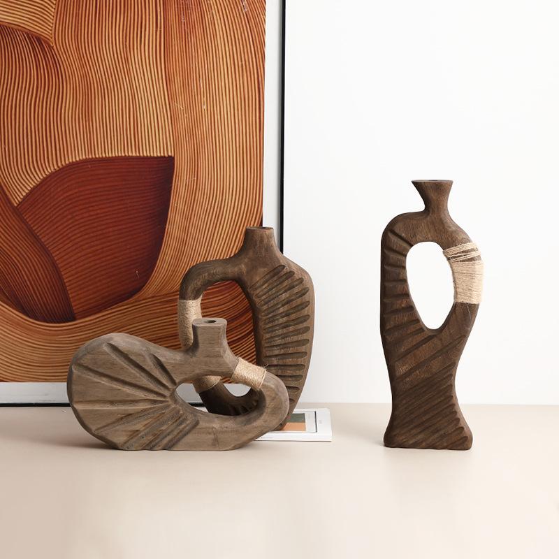 Handmade Wooden Vase Abstract Hollowed-out Natural Wood Flower Vase Flower Arrangement Accessories Hemp Rope Home Decoration
