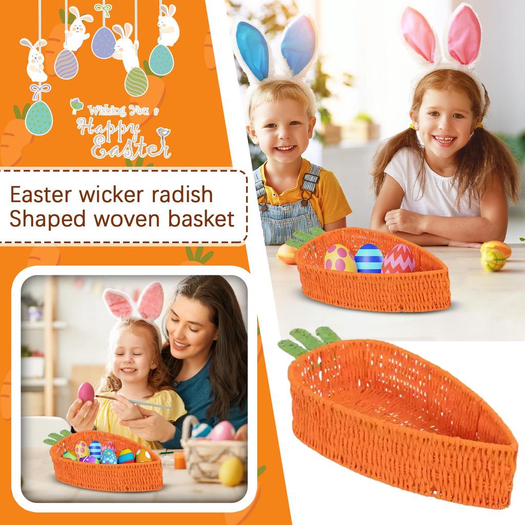 Easter Woven Radish-shaped Basket For Storage And Decoration Bring the charm of spring home! This adorable Easter wicker carrot basket, handwoven from natural materials, features a classic carrot shape, bringing you a back-to-basics festive feel. More than just a storage tool, it's a work of art that brightens the spring atmosphere, perfectly suited for Easter decorations and gift-giving.