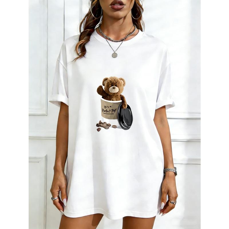 Oversized T-Shirt Black Teddy Bear In Coffee Cup Print For Casual Wear