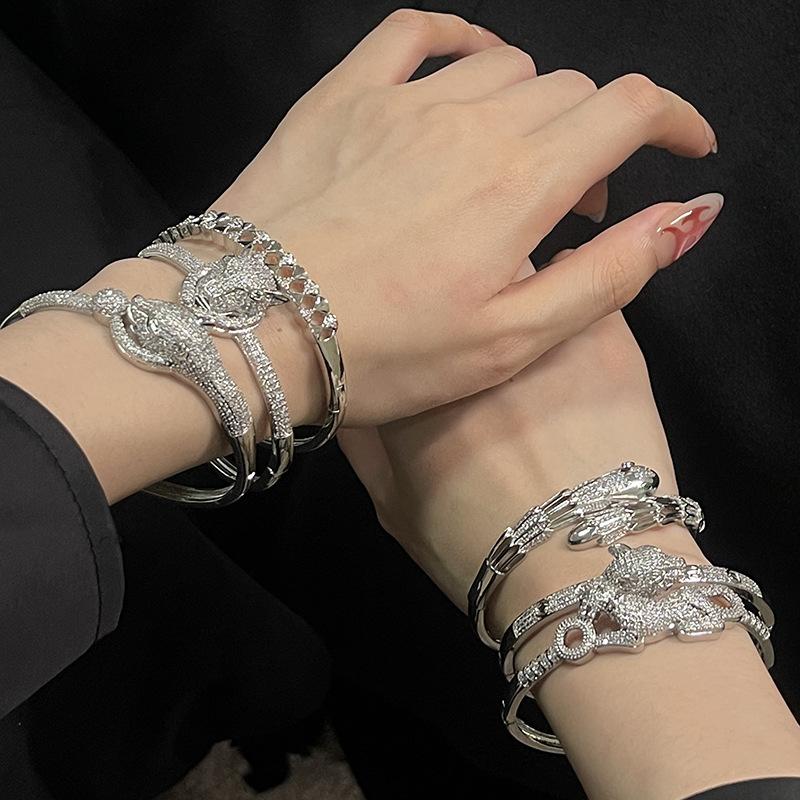 Luxury Overweight Full Diamond Zircon Green Eyes Leopard Opening Bracelet Series Banquet Accessories High-End Personality Bracelet