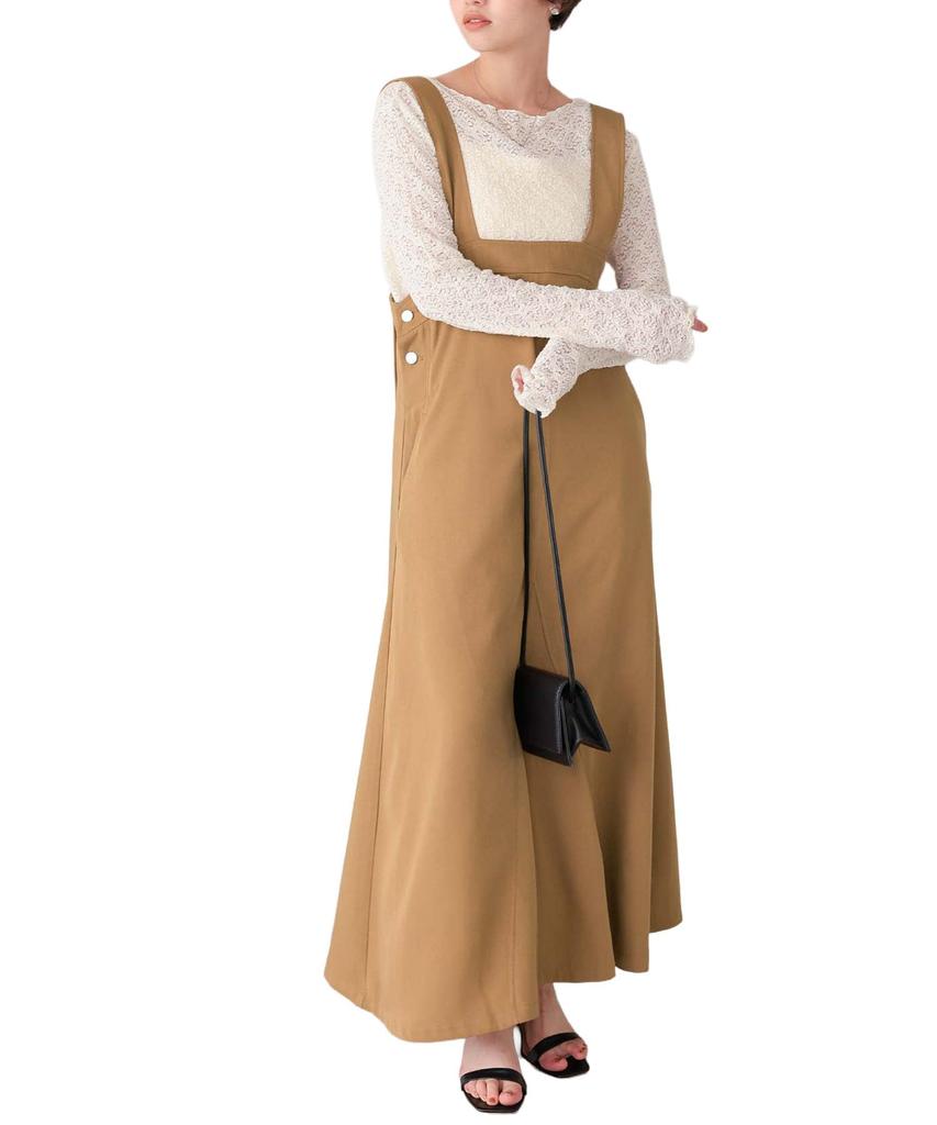 This jumper skirt combines a beautiful, feminine silhouette with versatile styling, making it a statement piece. Simply wearing it will elevate your style and elevate your sophisticated look. Key Features: ・Beautiful flared line: The soft, flowing silhouette naturally flatters your figure, adding a touch of femininity. ・Elegant material with a drape: The perfect amount of firmness and drape, without being too sweet, makes it a perfect match for both smart and casual looks. ・Adjustable shoulder straps: Adjust the length to your liking. It's easy to balance with your innerwear, allowing for a versatile look. ・Perfect back styling: The buckle and long ribbon design add a sophisticated touch to your back. A picture-perfect finish from any angle. Coordination: Casual: Pair with a cut-and-sew or ribbed knit and sneakers or flats for a relaxed, everyday look. ・Stylish: Pair with a blouse and turtleneck and pumps or short boots for a sophisticated finish. - Great for all seasons: Lightweight in spring and summer, paired with knitwear and tights in autumn and winter, it can be worn all year round. It's a reliable, excellent item that looks great on its own and can be used in any situation or season.