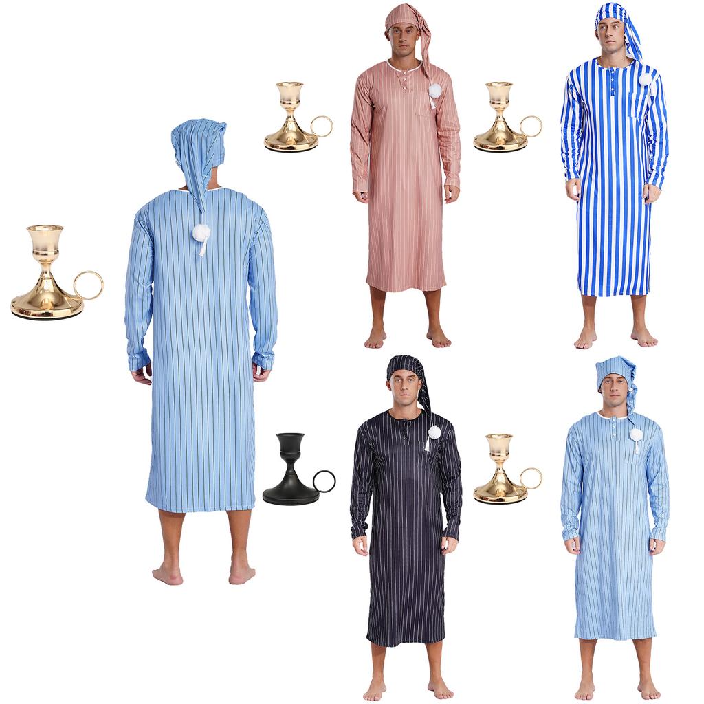 Men's Christmas Sleep Dress Set with Hat & Candlestick Striped Long Sleeve Pajama Robe for Party