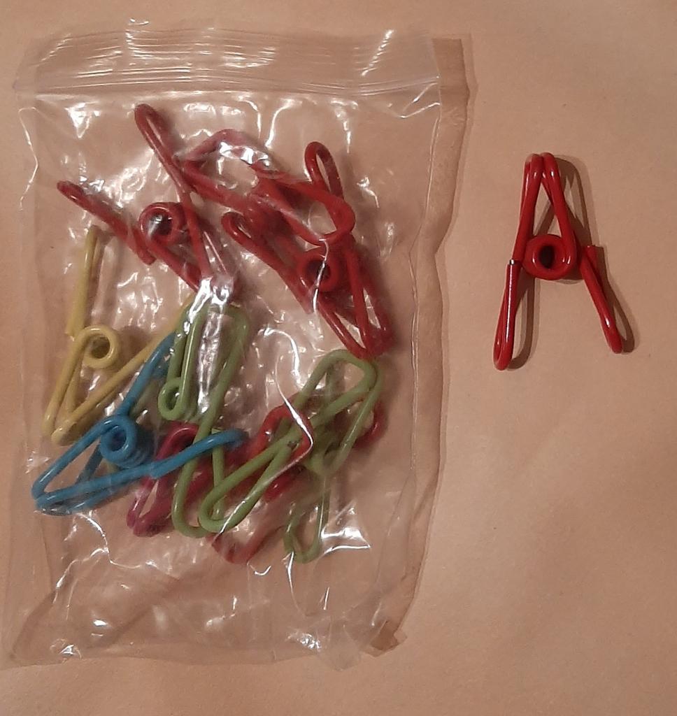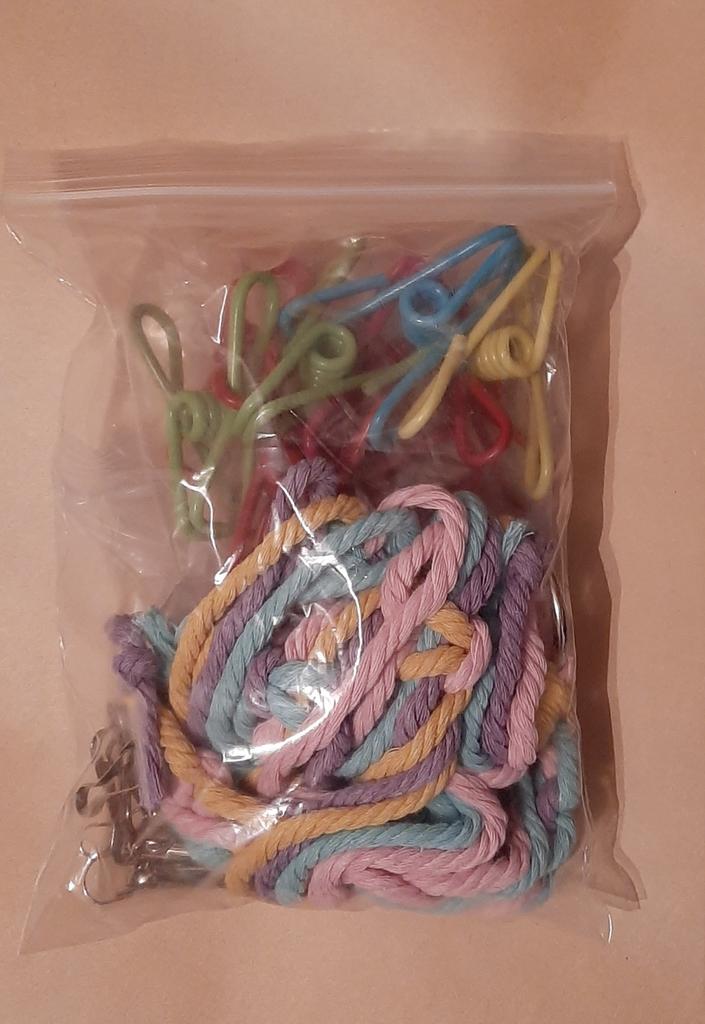 10 multi-colored clothespins (one yellow and one blue, 2 green, and 6 red) and a multi-colored cord 2m long, with metal rings at both ends for easy hanging (so there's something to attach to). Additionally, several metal hangers are included in the set.. Thank you Joom for the win! I liked it. I recommend the seller and of course Joom!