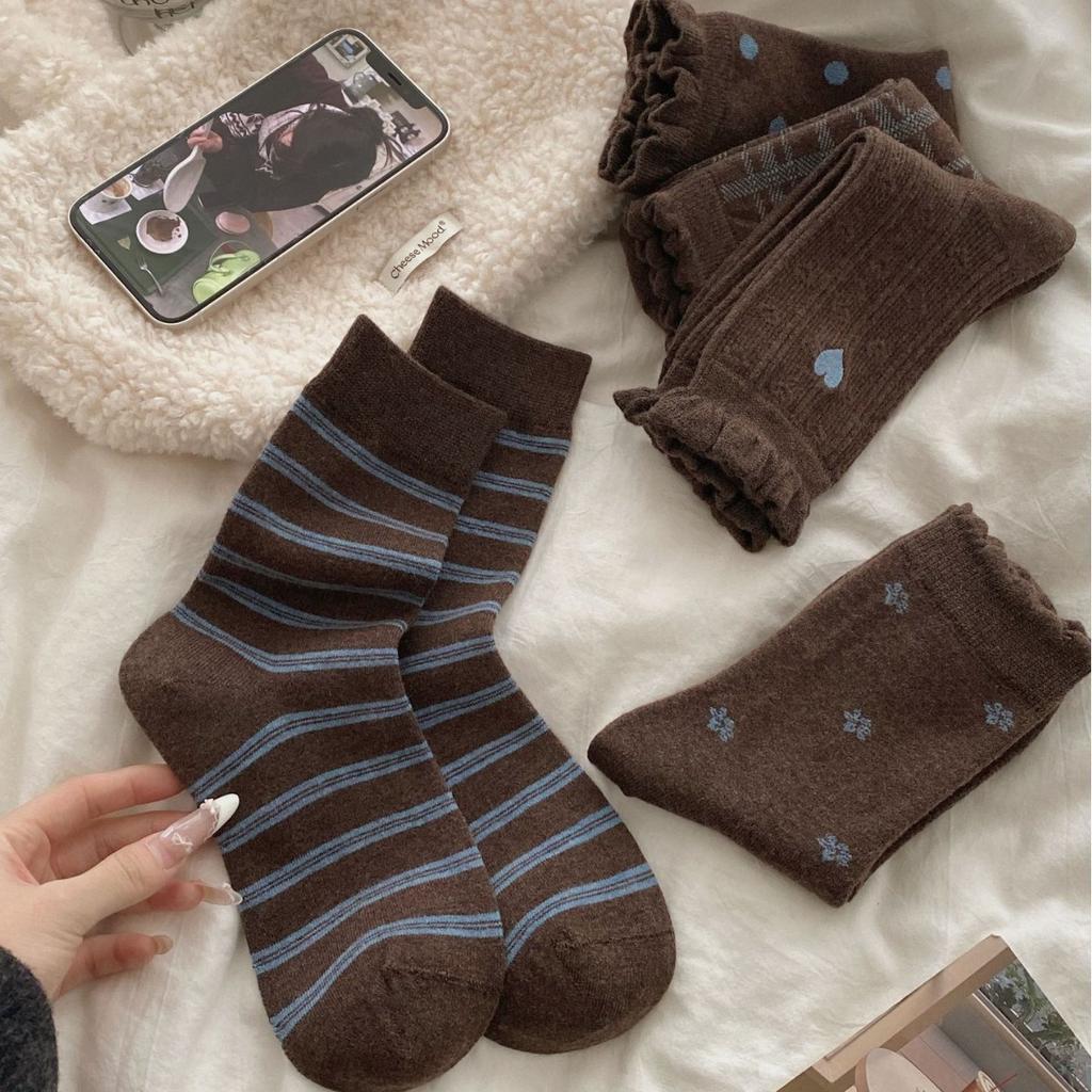 Autumn and Winter Striped Heart-shaped Coffee-colored Wool Socks, Polka Dot Mid-calf, Retro and Versatile, Pile Socks for Women