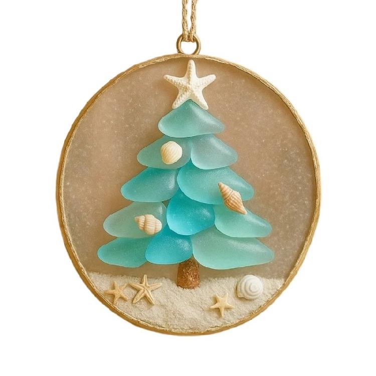 Hand-polished sea glass combines with a golden frame to softly revive the water tones, symbolizing the tranquility and sacredness of the birth of redeemer. Suitable for hanging in christmas trees or home spaces, adding a touch of artistic atmosphere of nature and faith to festive decoration.