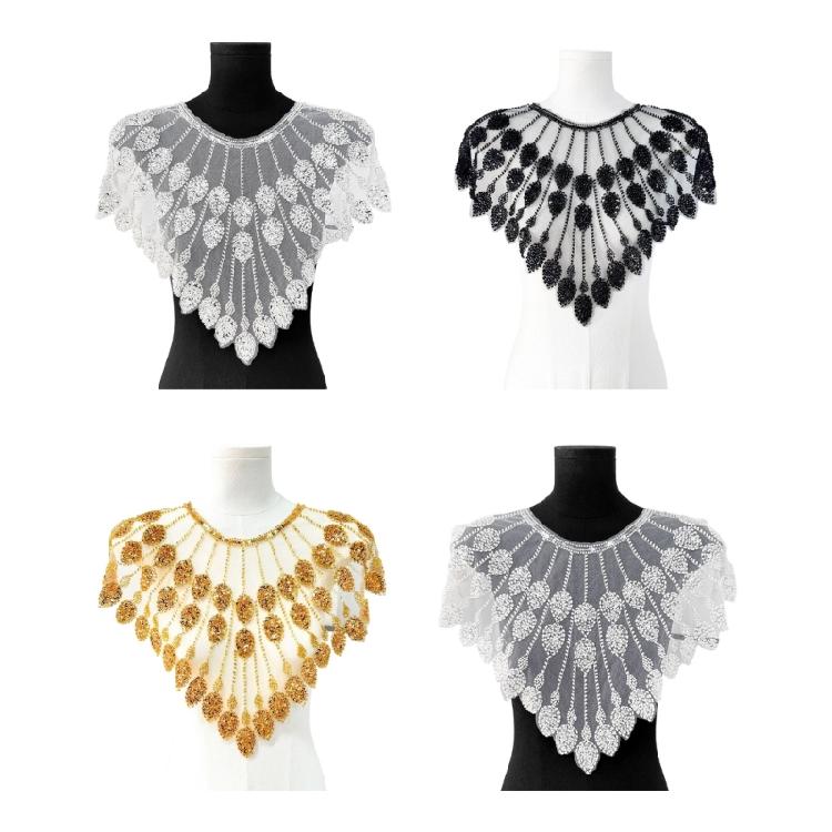 Crafted with polyester and intricate embroidered beads sequins embellishments, this leaf like embroidery applique sew on collar patches offer luxurious, fade resistant clothing embellishment for wedding dress, evening gown and handmade costume accessories.