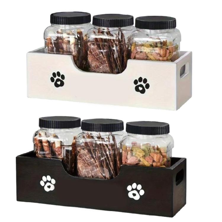 Keep your pet's snacks freshness and organized with this user friendly wooden pet snacks container featuring 3 seal plastic jars for secure dog/cats food storage.