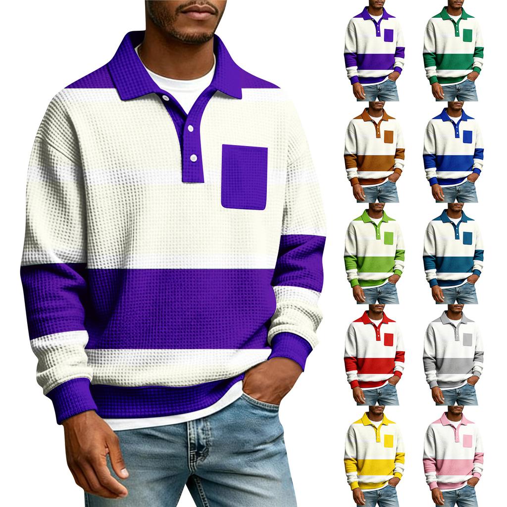 Men's Striped Single Breasted Long Sleeved Shirt With Collar And Pockets Casual Sports T-shirt