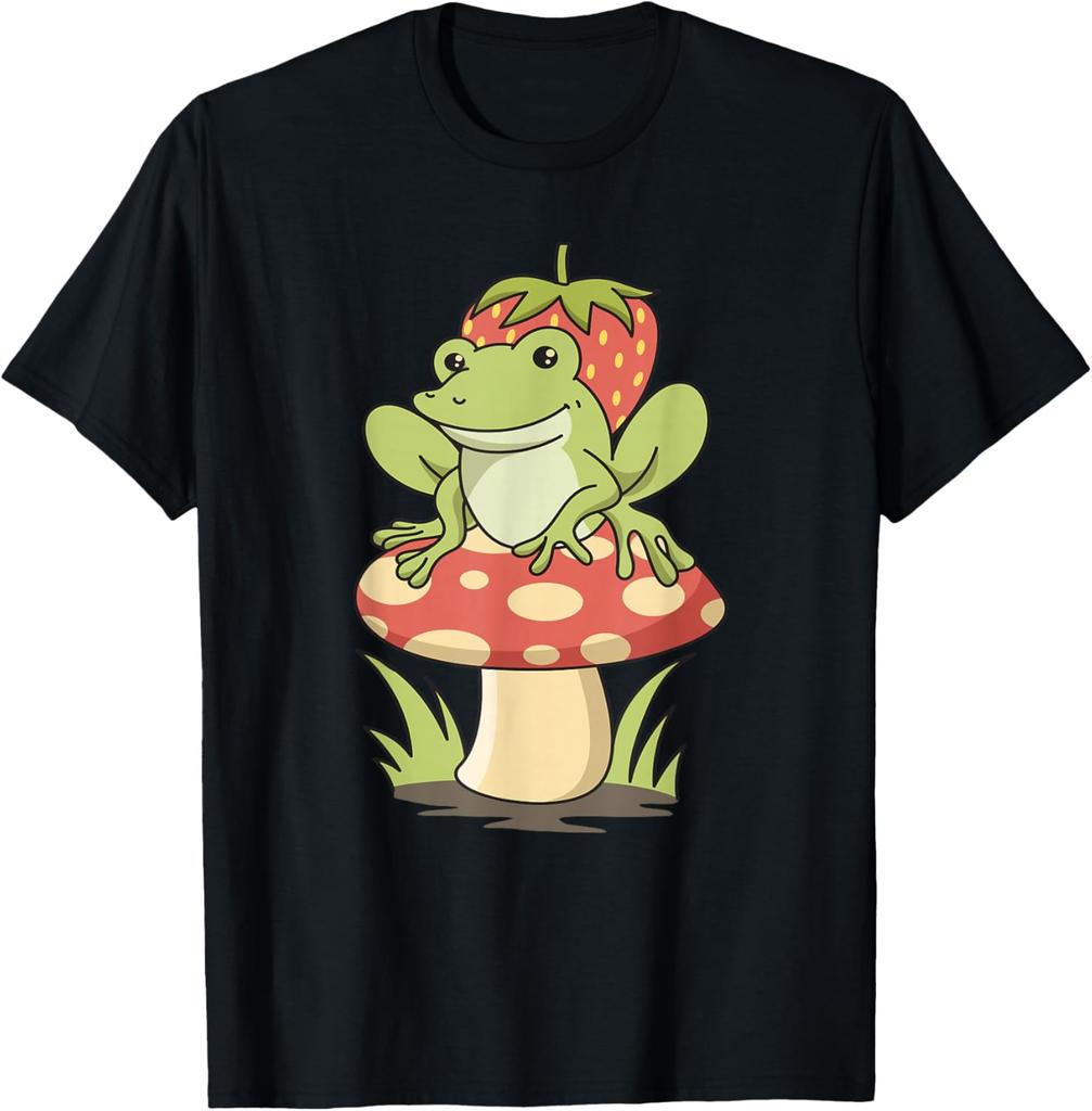 Cute Frog Strawberry Mushroom Graphic Tee Cottagecore Aesthetic Casual Round Neck T-Shirt