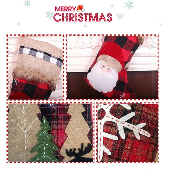 Original Design: Great value Christmas stockings with Santa, Snowman, Christmas Tree, Snowflake and Reindeer. Plush faux fur cuff design and plaid style Xmas stockings can set off the Christmas atmosphere.