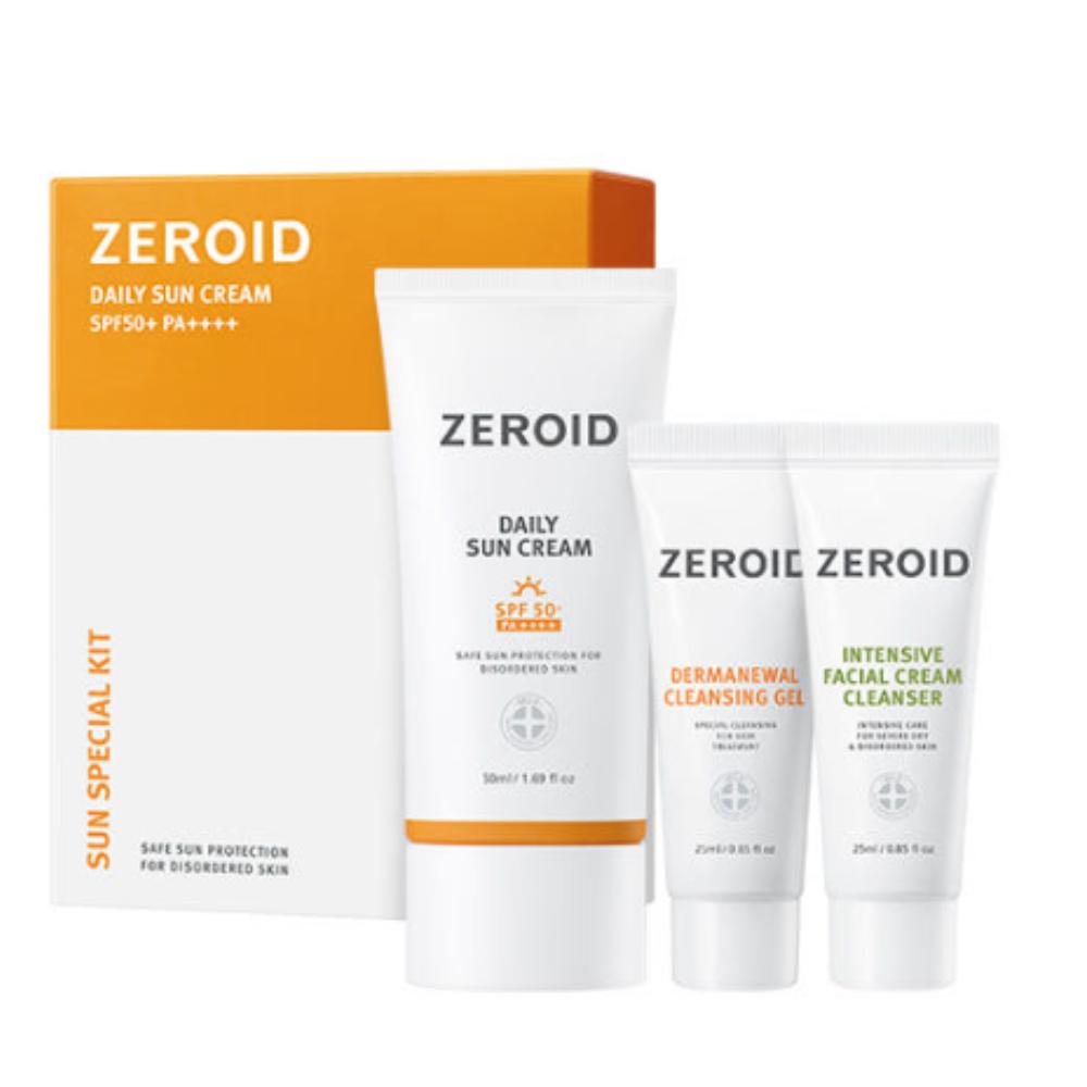 ZEROID Daily Sunscreen SPF50+ PA++++ Set includes a full-size sunscreen and two gentle cleansers. Daily UV protection and mild cleansing care for sensitive skin.