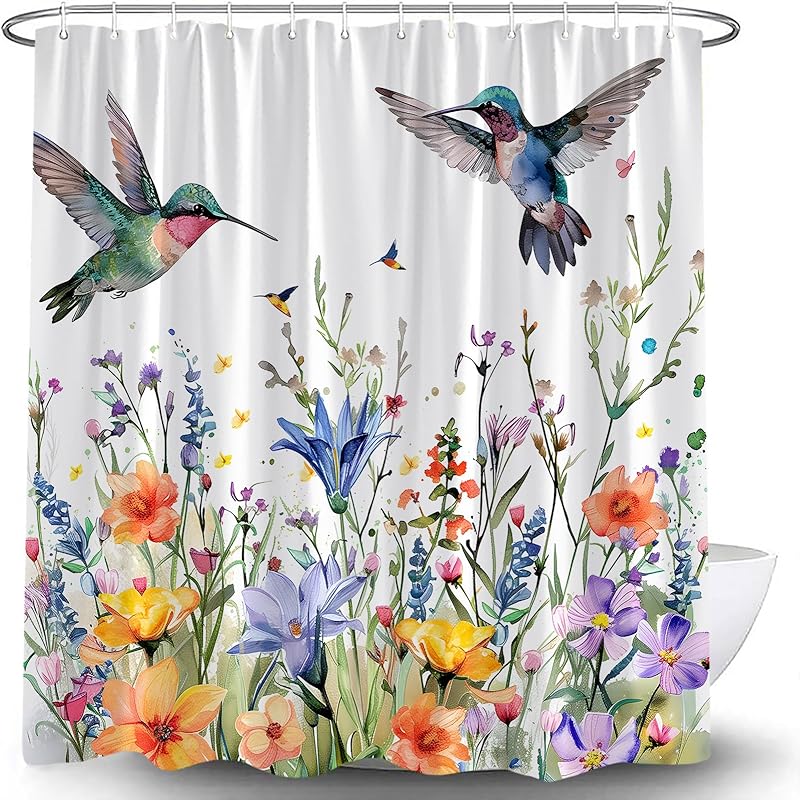 Hummingbird Shower Curtain Spring Colorful Birds Watercolor Floral Leaves Nature Garden Scenery Modern Blooming Flower Plant Fabric Curtain with Hook