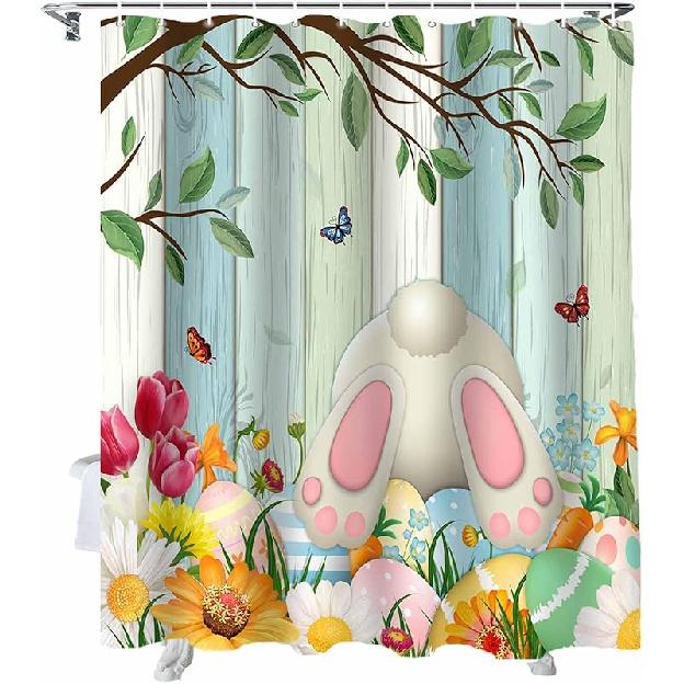 Happy Easter Shower Curtain Bunny Bathroom Curtains with Hooks, Waterproof Fabric Flower Carrot Rabbit Shower Curtains Set for Bathroom Bathtubs