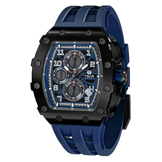 TSAR BOMBA Water Resistant To 5 Luxurious Tonneau Stainless Watch In Black and Blue Men's Wristwatch, ATM, Shape, Steel, Business, Sports, Luxury,