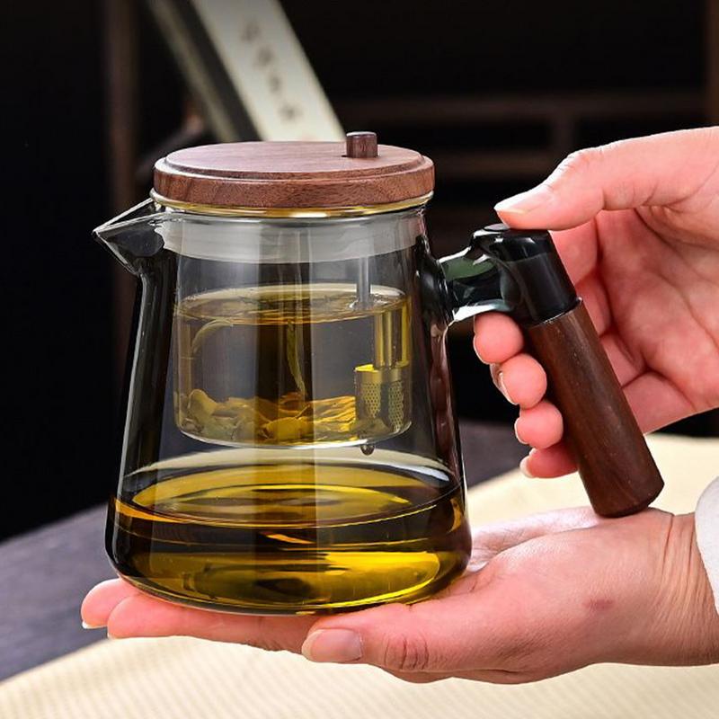 Heat Resistant Tea Kettle Glass Teapot With Wood Handle Filter Tea Pot Inner Tank Ergonomic Comfort Maker For Home Living Room
