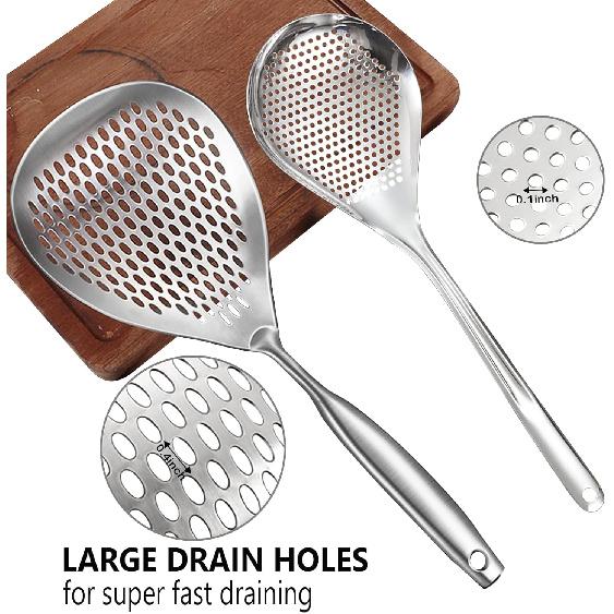 QUICK TO DRAIN - Uniform oval holes design of the skimmer slotted spoon maintains the maximum speed of draining, can be used for draining a variety of food in deep frying and cooking. Oval holes in the strainer bowl make draining quick without your food slipping through during cooking. It can even be used for cleaning vegetables and fruits.