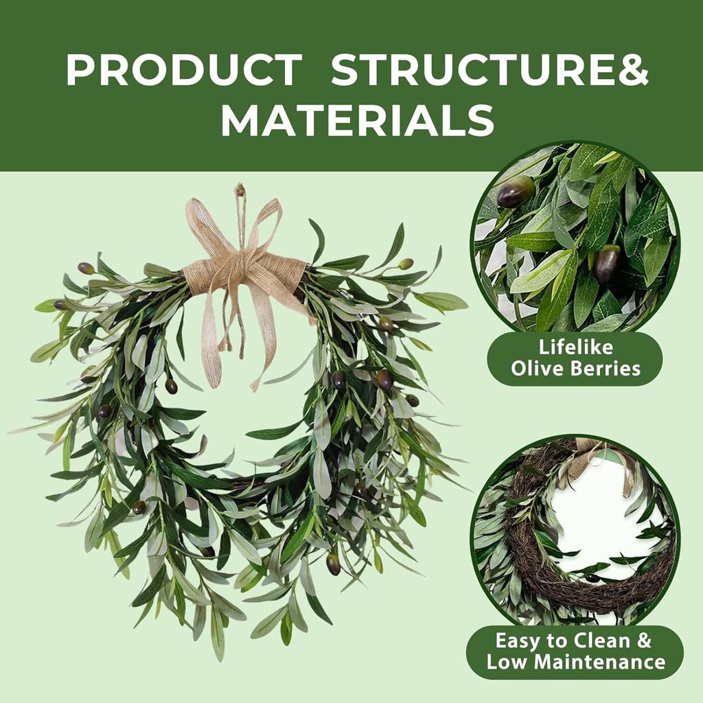 Artificial Olive Garland with Greenery Leaves – Faux Olive Wreath for Front Door, Farmhouse Wall Decor, Hanging Green Wreath for Window or Wedding