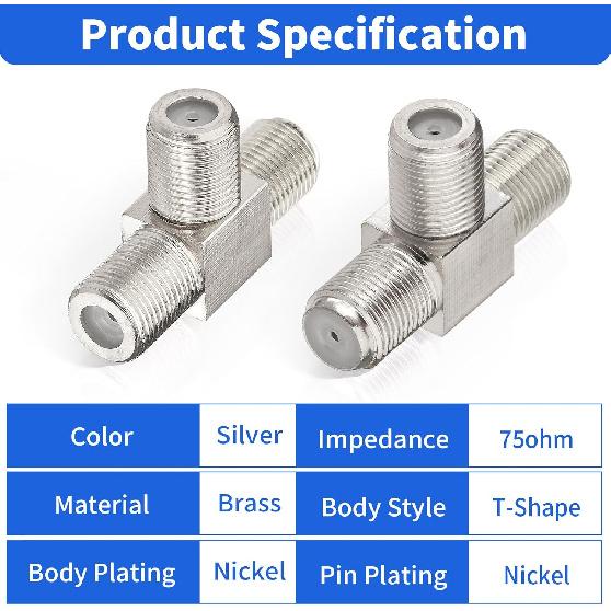 Wlaniot F Type Splitter 3 Way F-Type Female To 2 Female Coaxial Connector Adapter T-Shape for TV Video VCR Antenna TV Cable Satellite Tuner Antenna