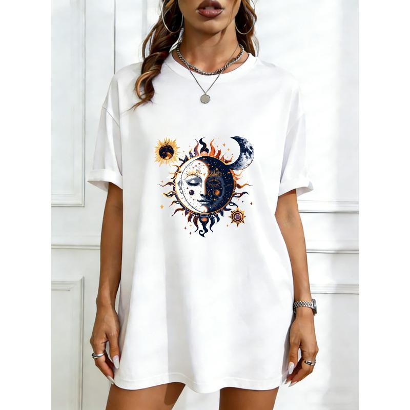 Oversized T Shirt Dress Black Sun And Moon Face Print For Casual Wear