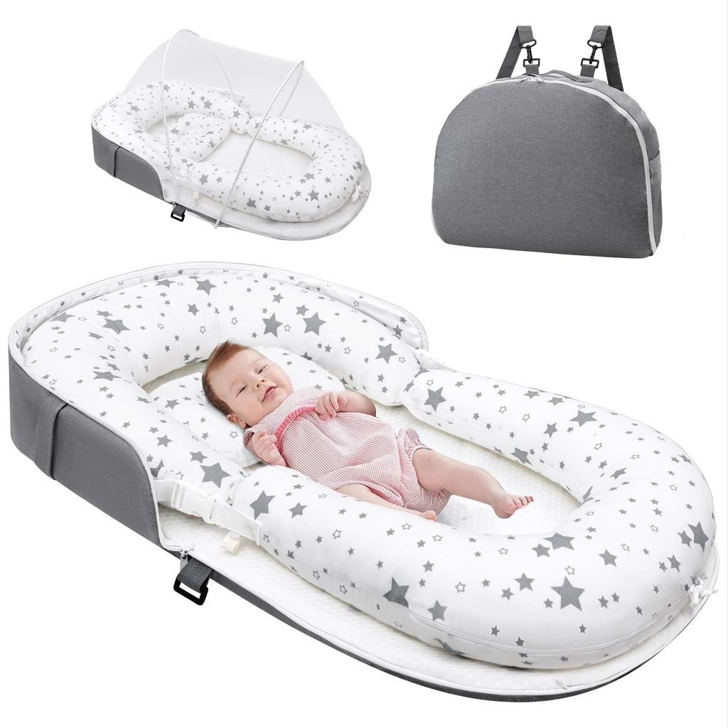 ATOPEN Folding Crib, Portable, Breathable, Waterproof, Washable, with Pillow and Mosquito Net, for Newborns and Babies, Includes a Star Shape (White)