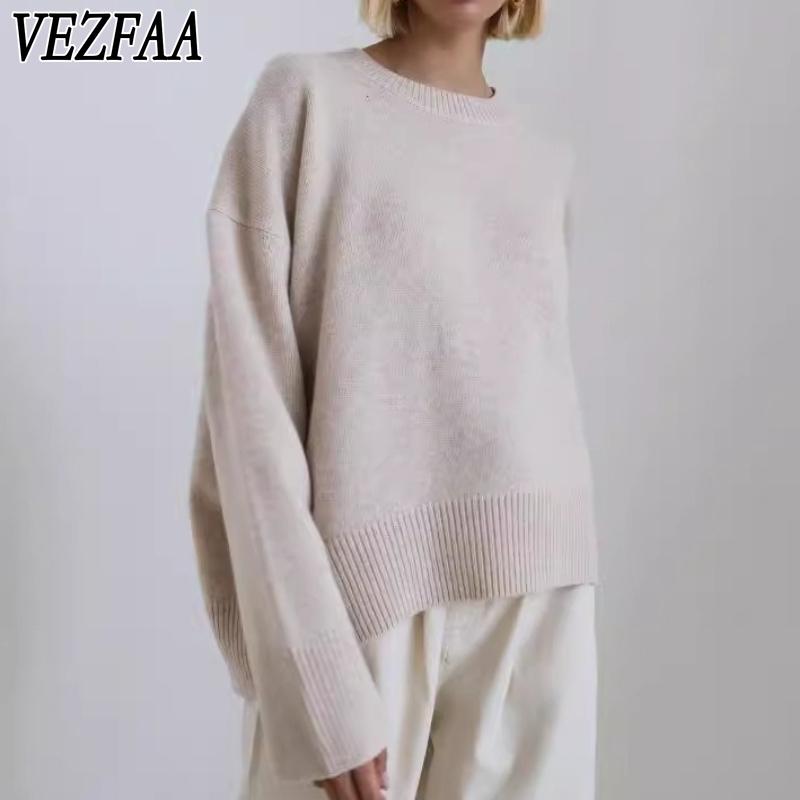 VEZFAA Women's Fashion Casual Fall Winter Solid Color Print Long Sleeve O-Neck Sweaters