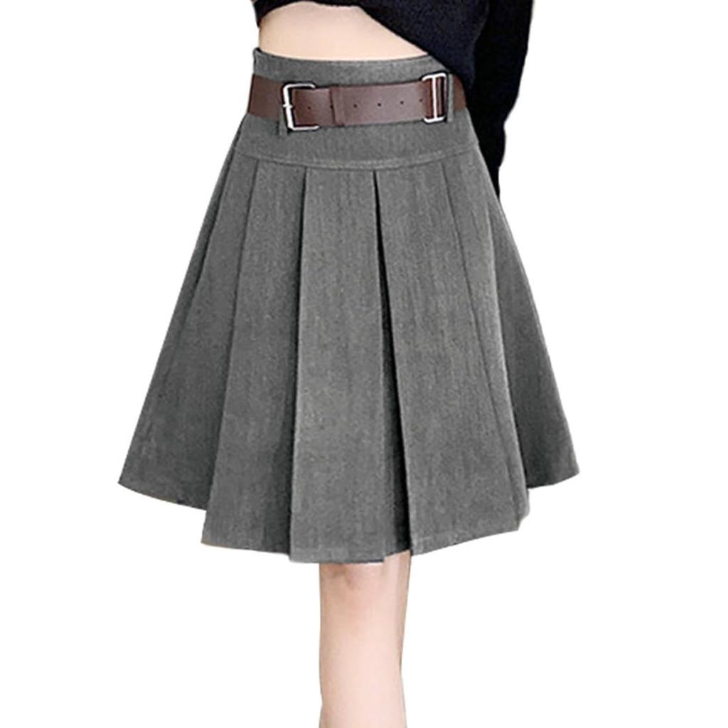 AIKA Mini Short Box Solid Size Gray Knee-Length Skirt, Skirt, Pleated, A-Line, Flared, High-Waisted, Short, Natural, Casual, Cute, Color, Women's, M,