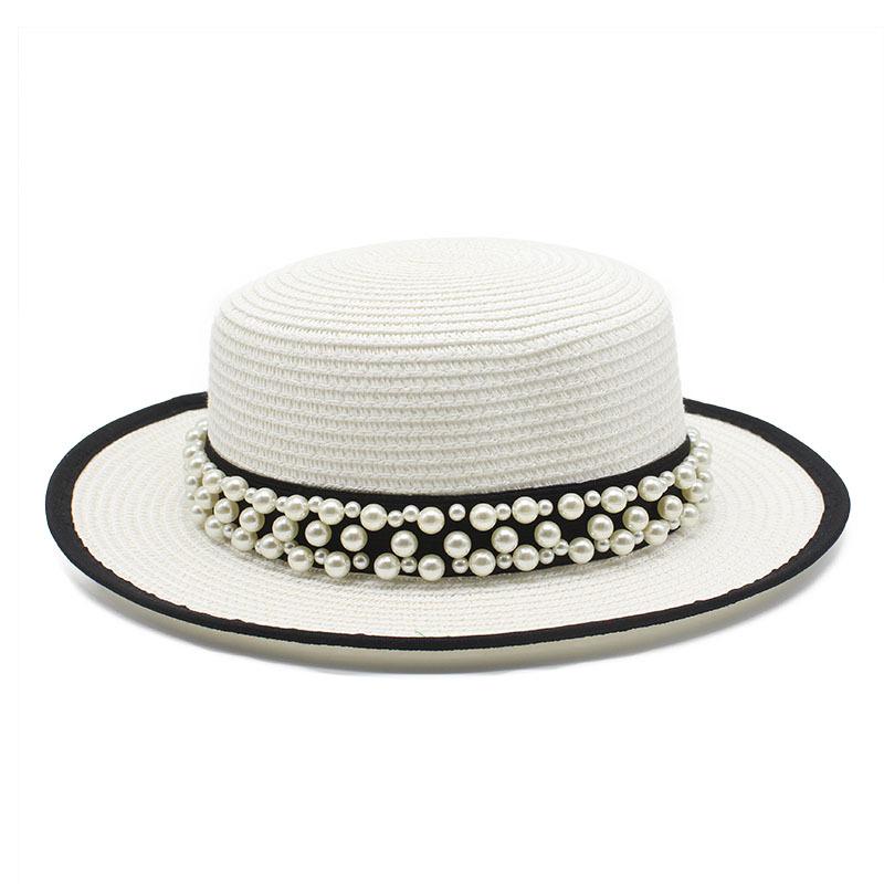 Summer Sunshade Sunscreen Big Brim Top Hat Women'S French Retro Pearl Chain Flat Top Hat Casual Versatile Straw Hat