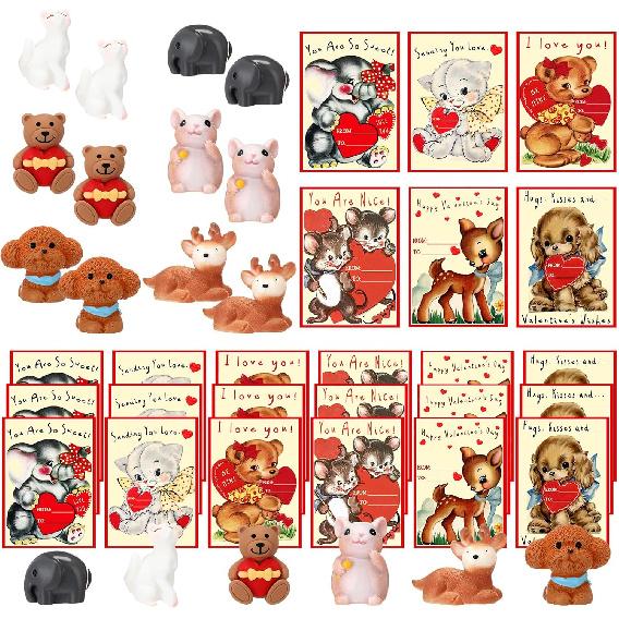 Sweet Valentine's Day classroom favors: with 24 animal resin figurines and matching retro Valentine's Day cards, these Valentine's Day party supplies offer a thoughtful and personalized gift choices