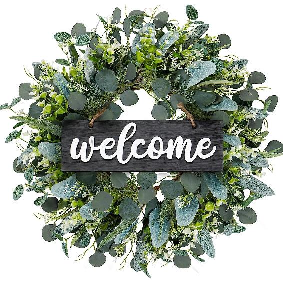 ❀【Eucalyptus Wecome Wreath】The wooden sign is separated from the wreath, but the welcome sign can be stuck to the wreath for easily hanging on the door,you can refer to the image to hang.The green leaves and branches are not easily falling apart,which can be used for a long time.